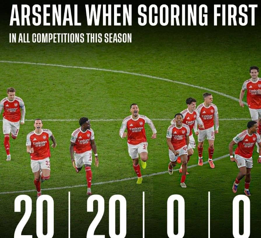 阿森纳本赛季必胜法宝揭秘:率先破门胜率100%,冠军之路呼之欲出